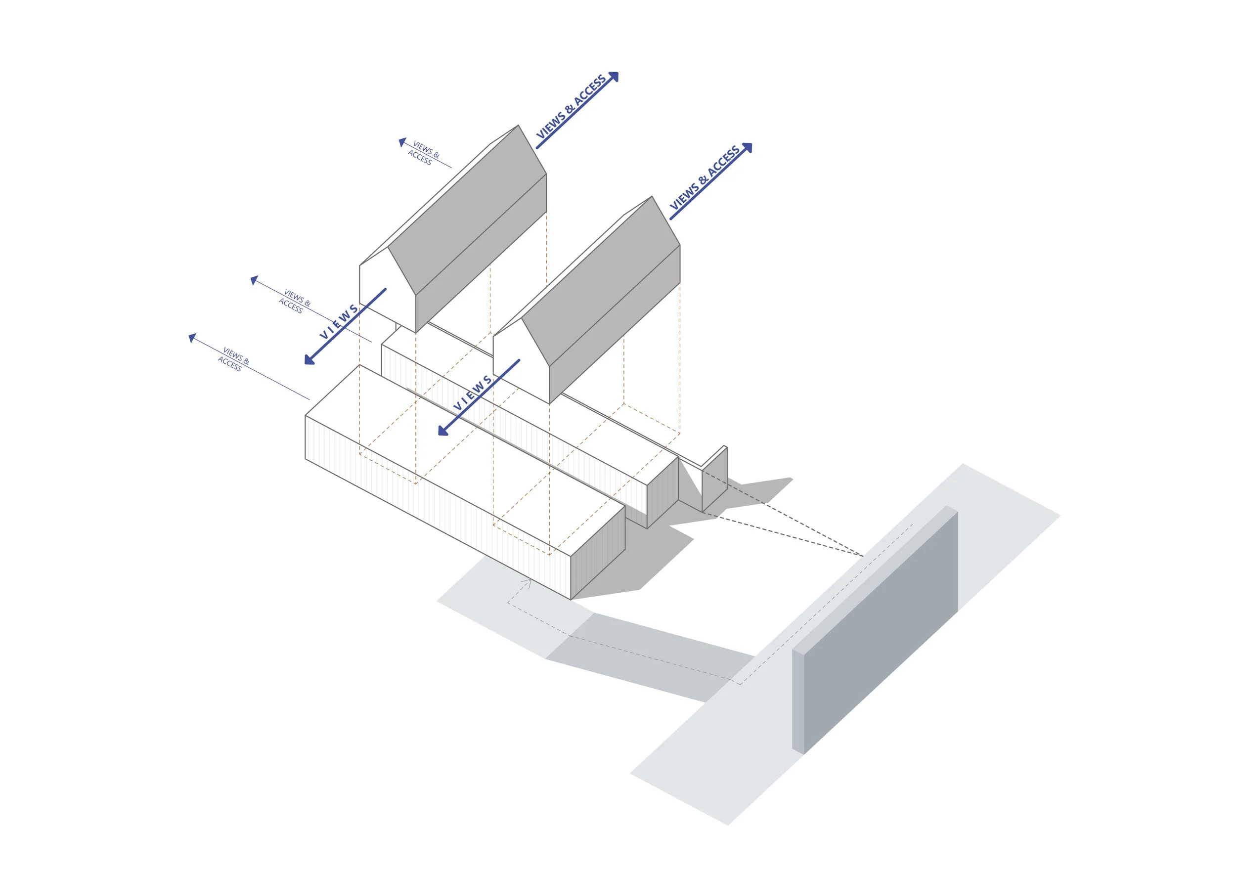 The first floor is organized into two long programmatic bars that run the length of the site. The main gathering spaces are positioned toward the rear for a quieter setting.